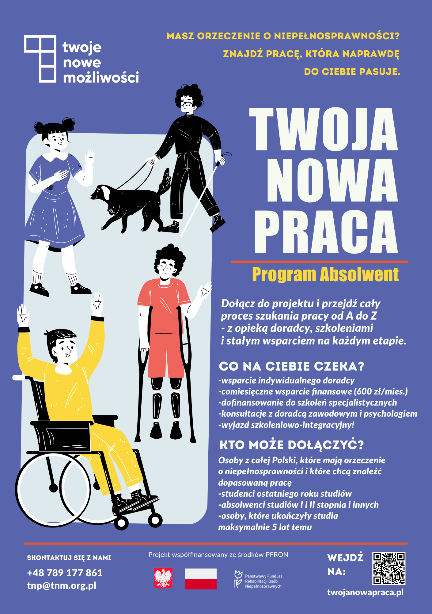 Stowarzyszenie Twoje Nowe Możliwości zaprasza do udziału w projekcie „Twoja Nowa Praca”, realizowanym ze środków Państwowego Funduszu Rehabilitacji Osób Niepełnosprawnych (PFRON) w ramach programu "ABSOLWENT II”. Celem projektu jest pomoc osobom z niepełnosprawnościami w znalezieniu i utrzymaniu zatrudnienia oraz wsparcie w rozwoju zawodowym.
